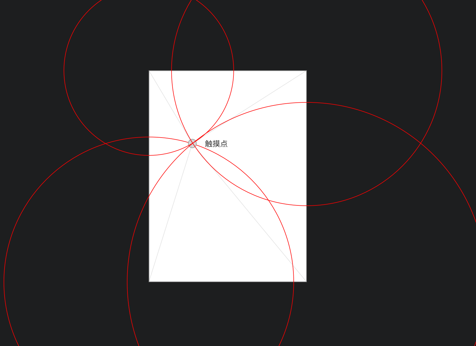 控制器先根据四个电极流出的电流大小计算出触摸点到四个电极的距离,然后以这个距离为半径进行画圆,会画成四个圆,这四个圆的交点就是触摸点的位置。图中的灰色圆点就是触摸点,四条灰线是到电极的距离,红色的圆是以灰线为半径画的圆,我们看到,交点正好在我们的触摸点。